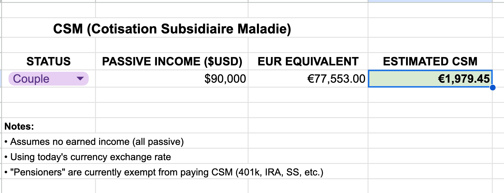 NOTE: Because they have no earned income and are not "pensioners", the couple will owe money (called CSM) to access French national healthcare. In this example, $1,979.45 per year for both of them.